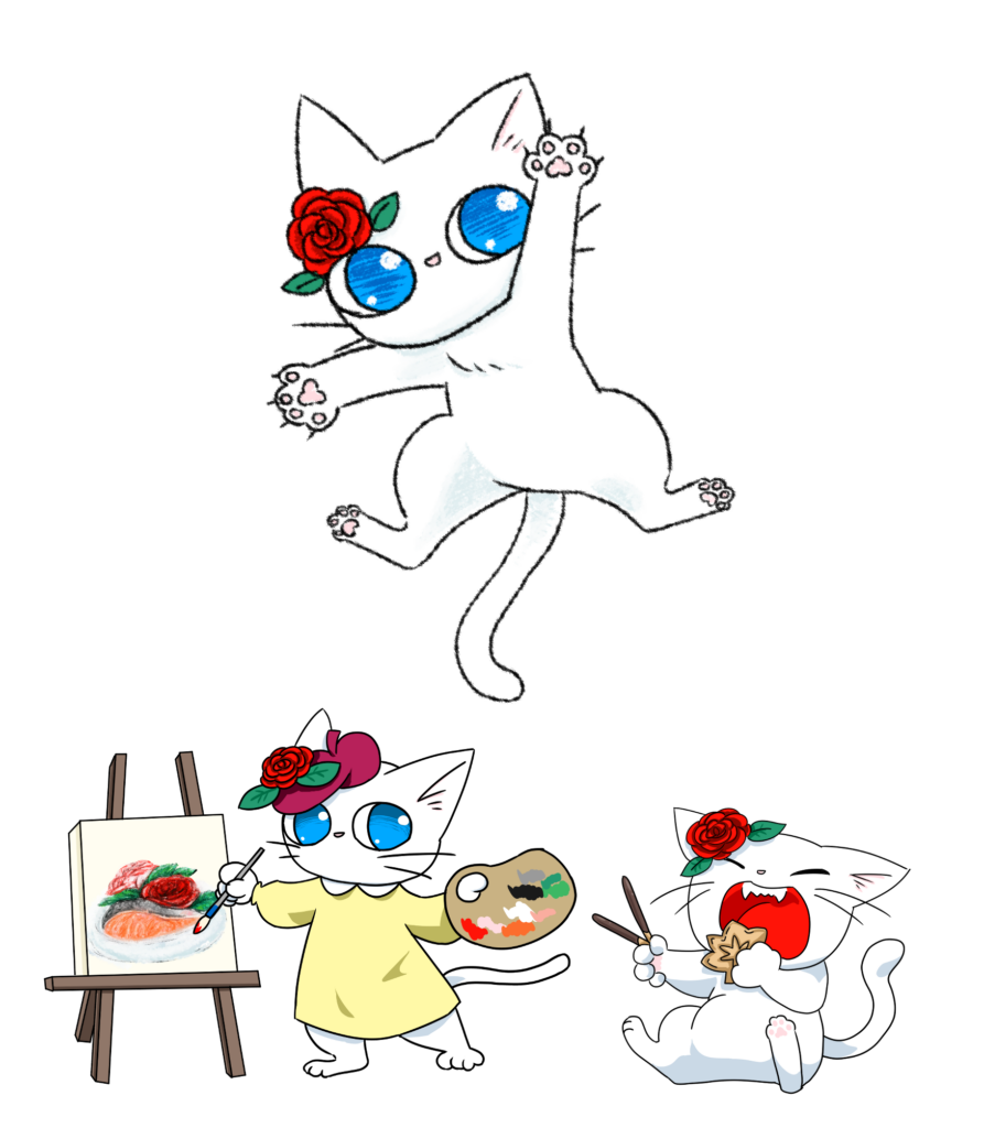 絵を見るのも描くのも大好きな白猫、ローズちゃん。好奇心旺盛で、とっても活発美味しいご飯やお菓子に目がない、食いしん坊右耳のバラのアクセサリーと、青い目がチャームポイント